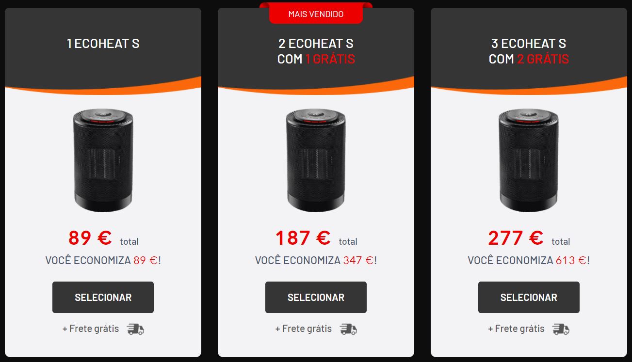 Há algumas opções de preço disponíveis no site de vendas do EcoHeatS. Se você está procurando EcoHeat S onde comprar aconselhamos que você acesse o site Oficial de Vendas através do Digitogy. Aqui podemos garantir que o produto é realmente o verdadeiro e original. Uma unidade do Eco Heat sai por 552,00 reais. Já duas unidades com um grátis está por 1.097,00 reais e você leva um dispositivo grátis. Há também opções para compra de três, com a posibilidade de levar cinco, etc. Será sempre ideal que você verifique as incríveis promoções disponíveis no site de vendas porque você realmente encontrará grandes negócios.